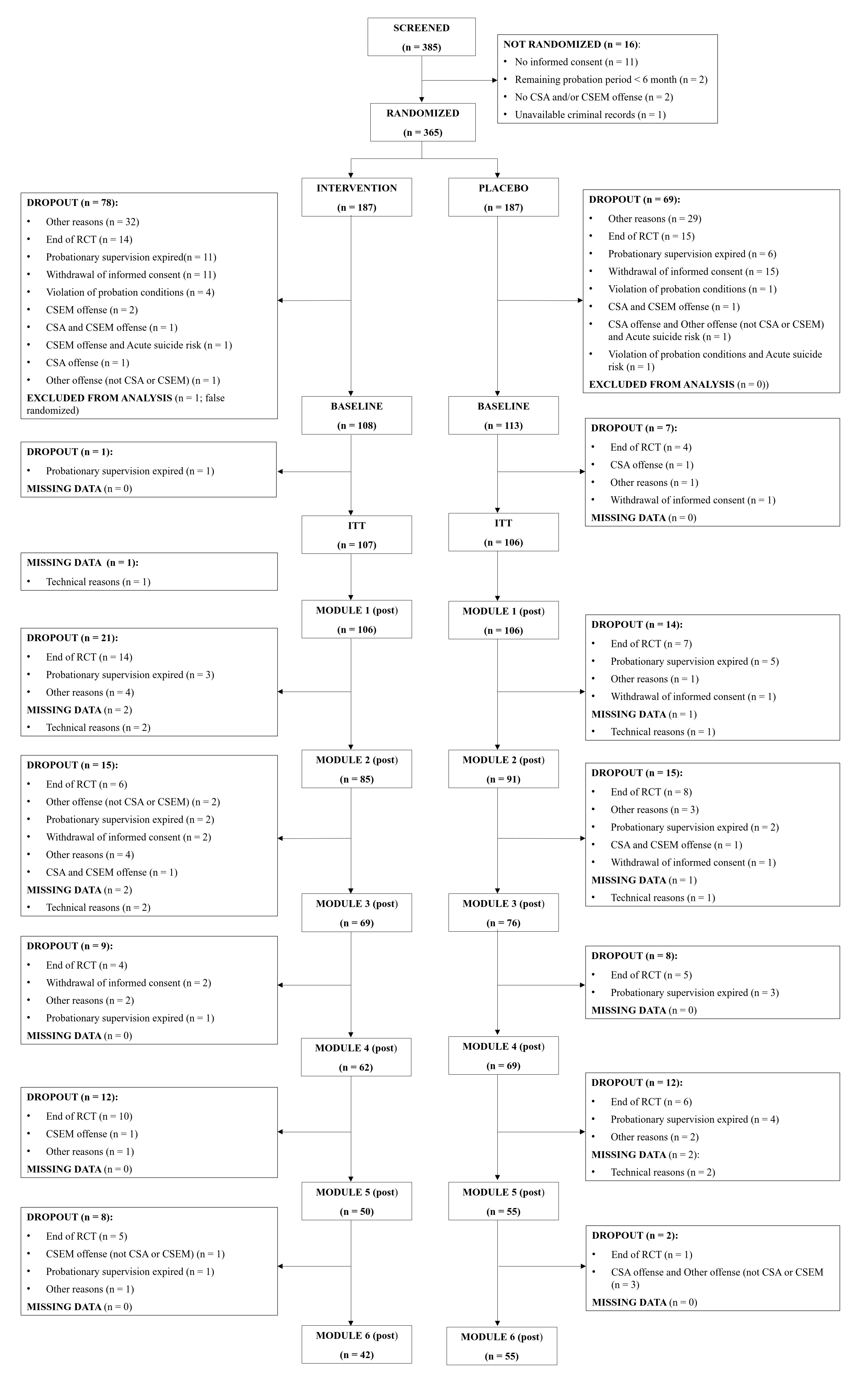 Between March 01, 2020, and September 30, 2024, 385 individuals who committed sexual offenses against children have been screened for eligibility, of whom 16 have not been randomized (see Figure 1). 369 individuals were randomly assigned (182 placebo arm; 187 intervention arm). 213 participants have been included in the ITT sample (107 [57·2%] intervention arm; 106 [58·2%] placebo arm). 99 participants finished the WBI (44 [30·2%] intervention arm; 55 [22·4%] placebo arm). The trial was closed due to end of funding. 70 participants were not able to finish the WBI before closing (39 [59%] intervention arm; 31 [53%] placebo arm).